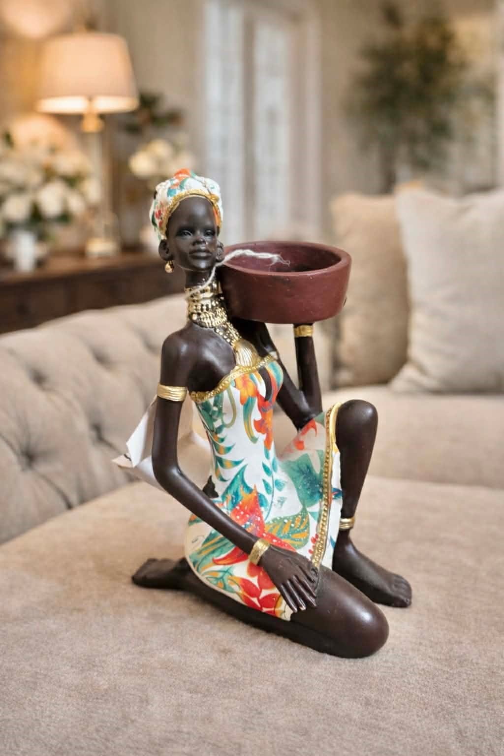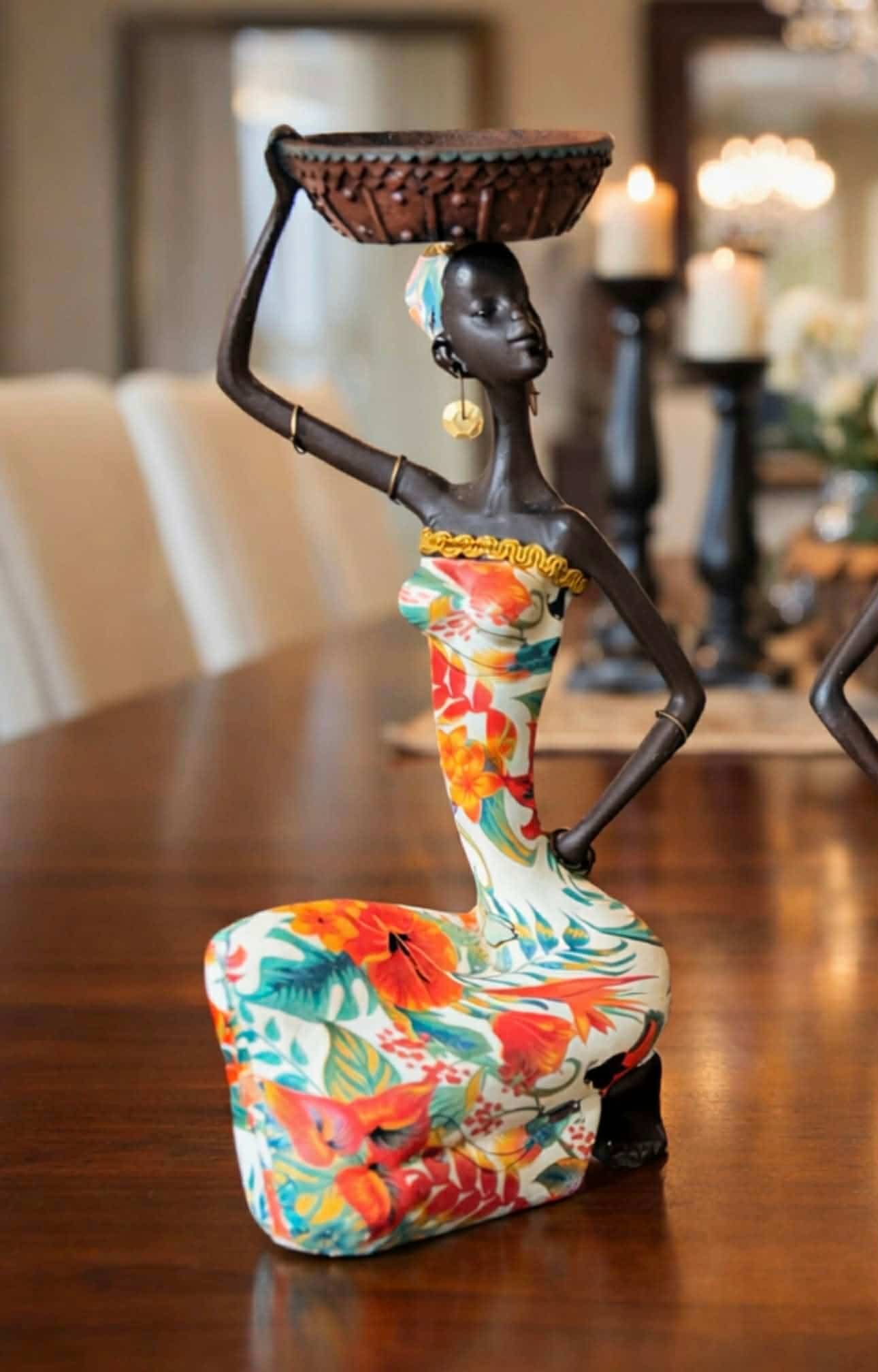 - Design: These figurines often represent African culture through traditional attire, jewelry, and headscarves. Some designs specifically feature women carrying bowls or vases on their heads, which function as holders for tealight candles.