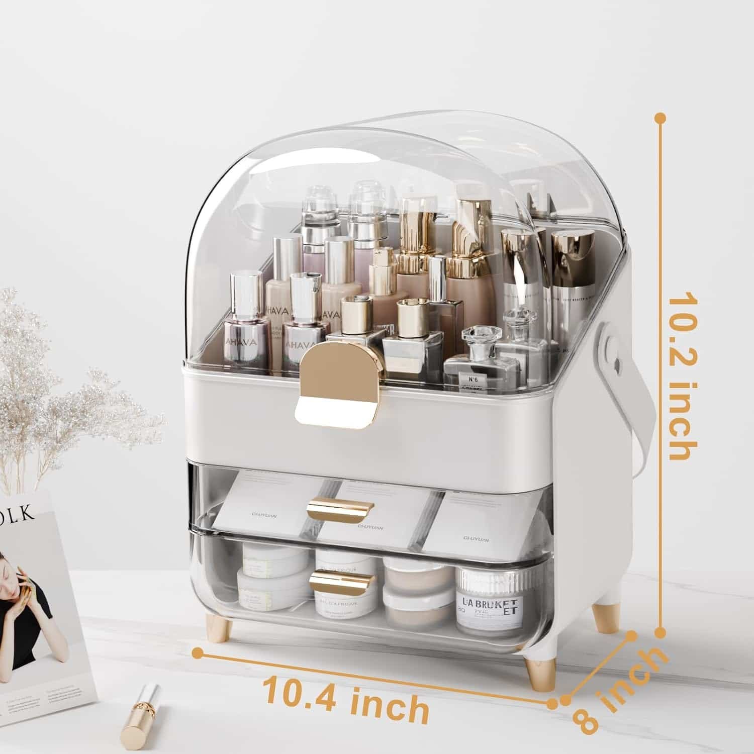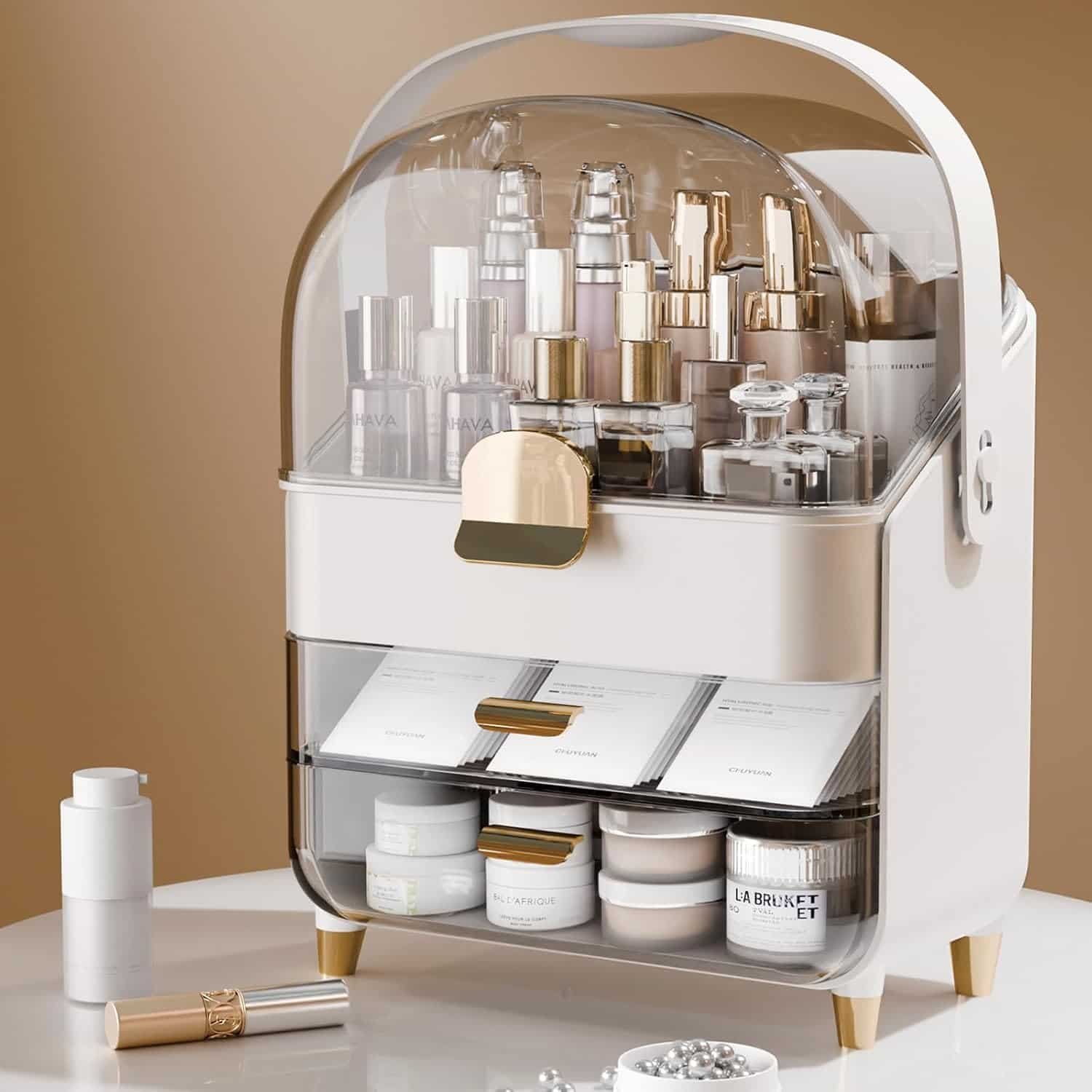- Elegant and Functional Design】This makeup organizer features a rounded appearance design, a transparent protective cover, and delicate golden handles with non-slip feet, adding a touch of elegance to your vanity while keeping your cosmetics organized.