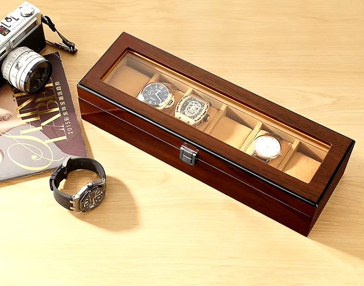 Elevate your timepiece collection with this exquisite these wooden watch box, designed for the modern connoisseur. Crafted with a rich walnut-grain finish and a plush, camel-toned velvet interior, this organizer combines sophisticated aesthetics with practical protection. The large glass display lid allows you to admire your collection at a glance while keeping your watches shielded from dust and scratches. Whether placed on a marble dresser or a luxury nightstand, its timeless design adds a touch of class to any room